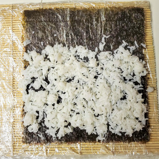 I like to cut off about an inch off the nori so the rolls come out smaller making them easy to enjoy in one bite.